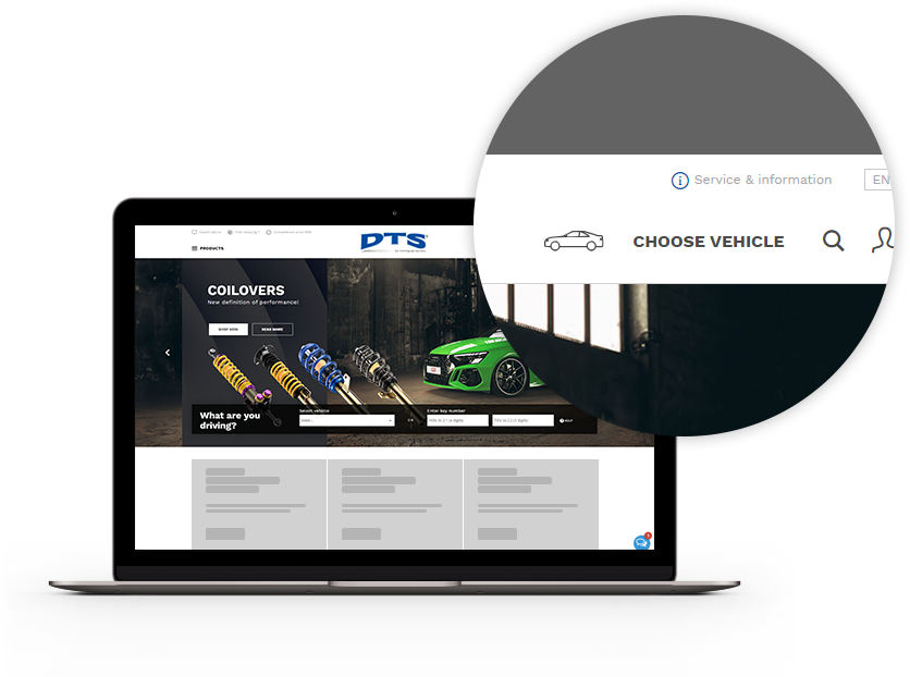 There is a small car symbol labelled "Select vehicle" at the top-right of the website. Click on this symbol to open the vehicle selection. You can select your vehicle there by choosing the options or entering the vehicle’s code numbers. Click "Help" for more information.